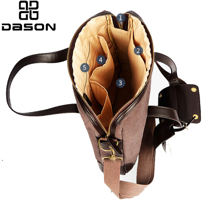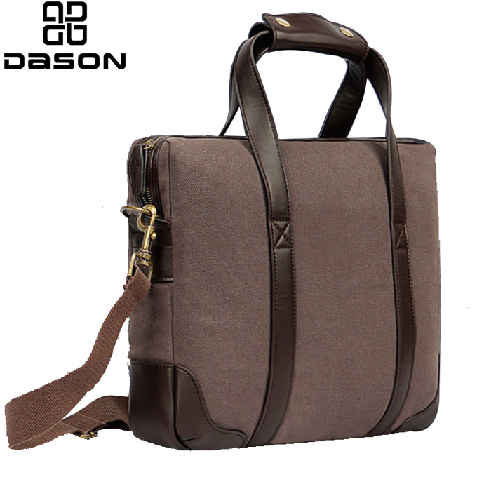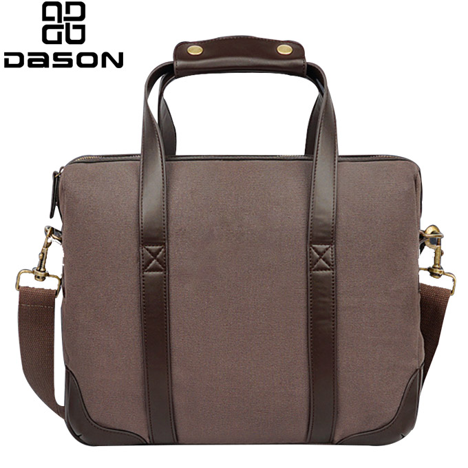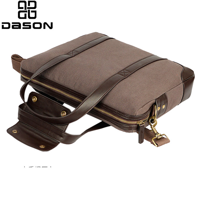 Dizajn platnene kurirske torbe za prenosni računalnik s klasičnim usnjenim ročajem in najlonskim naramnim pasom, z bronastim kavljem in zaponkami